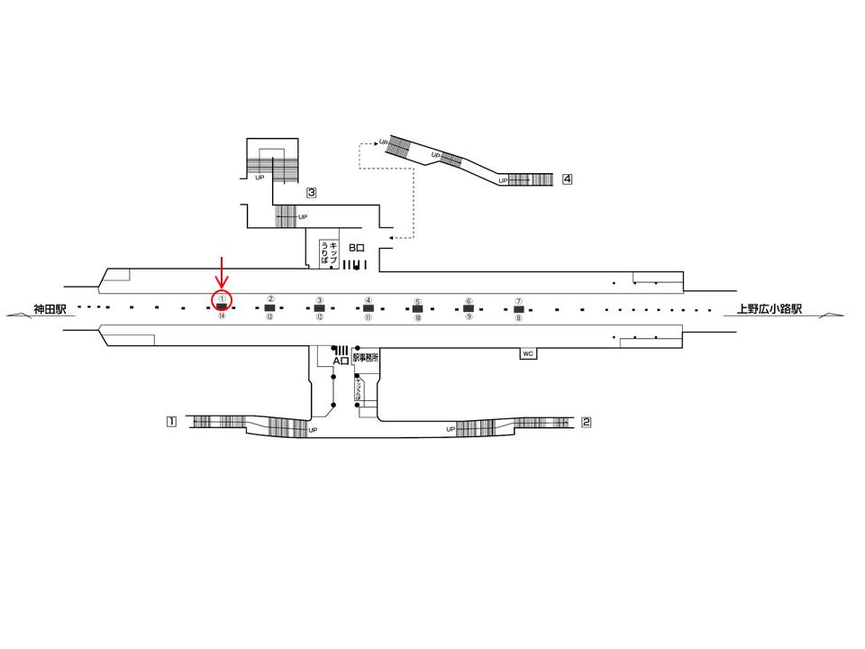 サインボード「銀座線 末広町駅 №1」は後方の神田寄りにございます。