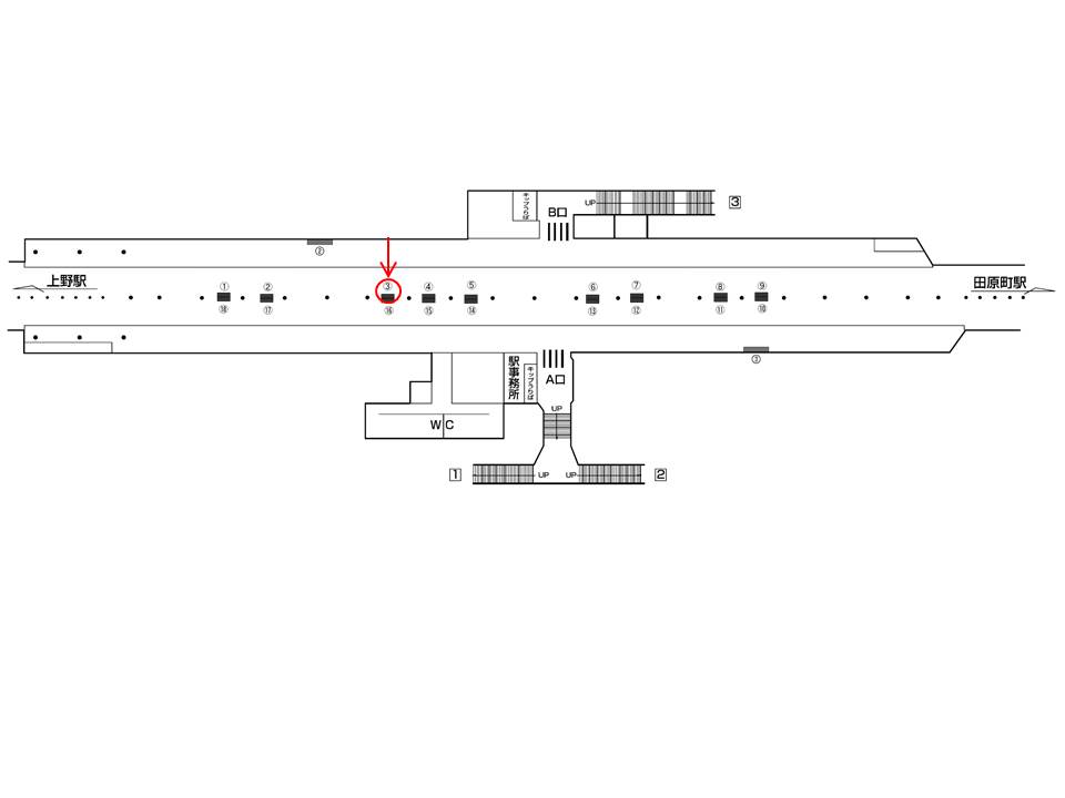 サインボード「銀座線 稲荷町駅 №3」はホーム中ほどにございます。