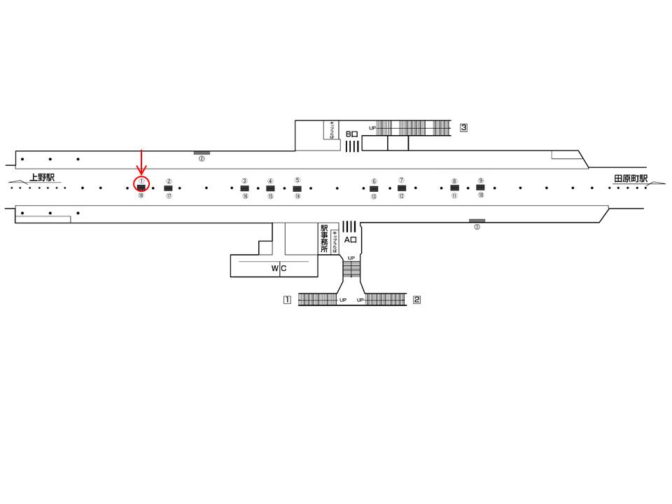サインボード「銀座線 稲荷町駅 №1」は車両後方の上野寄りにございます。