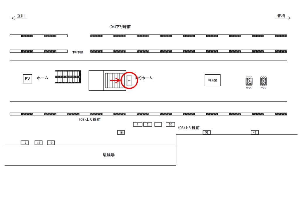 青梅線ホームに下りる際に使う階段の正面に設置された電飾タイプの広告看板です。河辺駅から上りの立川方面と下りの青梅方面へ向かわれる両方の方に見てもらえます。