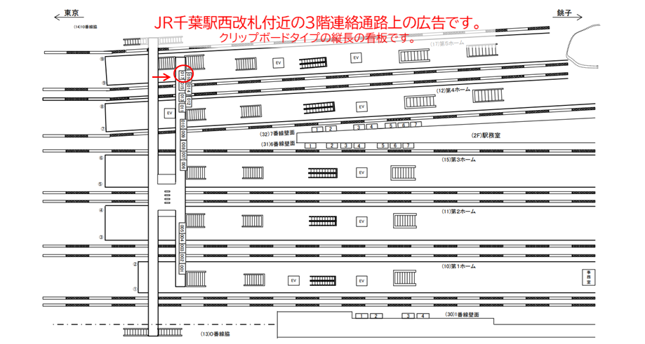 JR千葉駅の西口改札内の乗り換え通路にある看板です。9・10番線(総武快速線:上り東京方面 成田線:都賀・四街道・成田・佐原方面 成田エクスプレス)ホーム階段付近にございます。