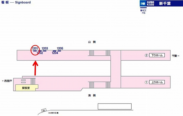 下りホーム(京成千葉・ちはら台方面行き)の看板です。