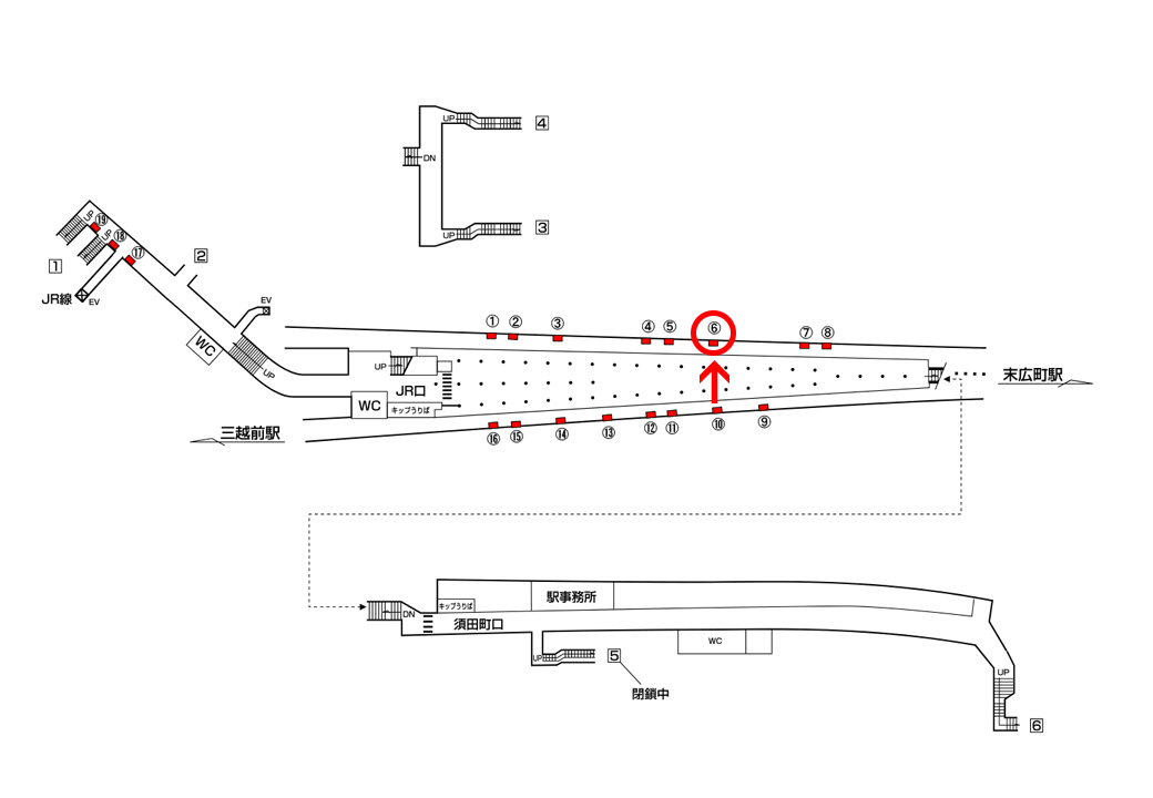 サインボード「銀座線 神田駅 №6」はホーム中ほどにございます。