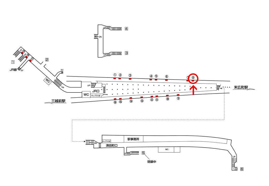 サインボード「銀座線 神田駅 №8」はホーム先頭の5番出口・6番出口方面改札への階段寄りにございます。