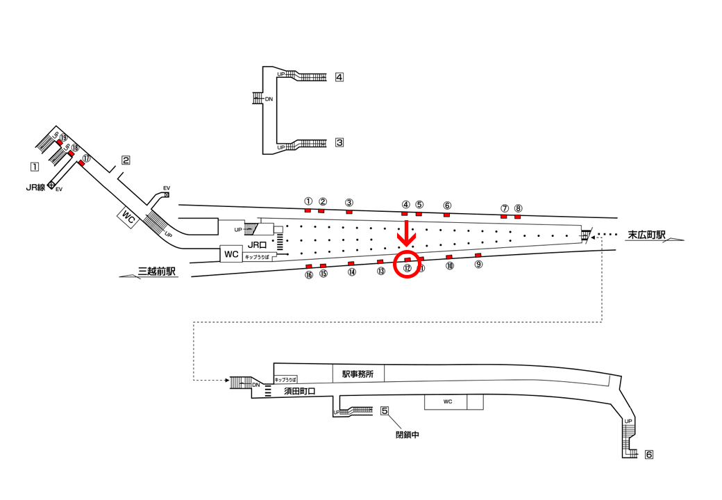 サインボード「銀座線 神田駅 №12」はホーム中ほどにございます。