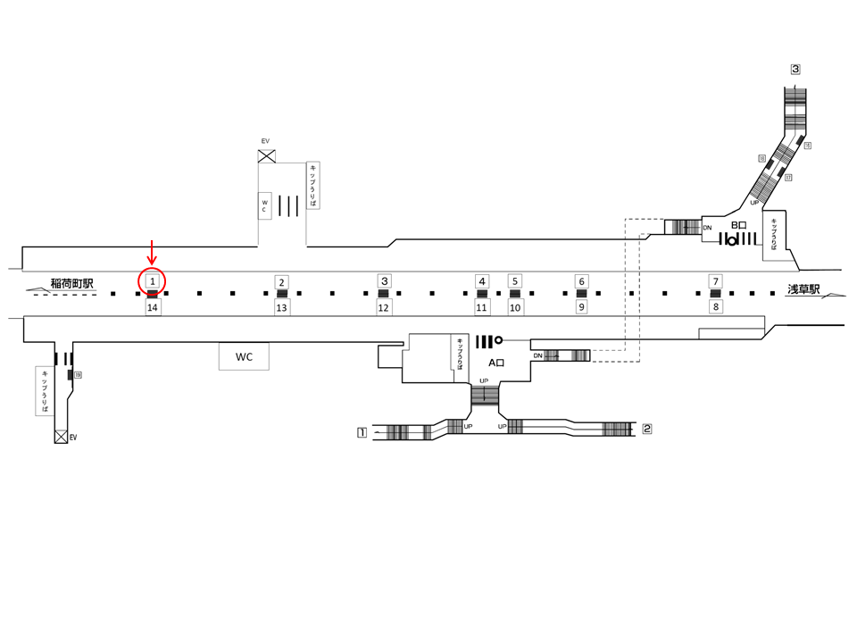 サインボード「銀座線 田原町駅 №1」は進行方向後方の稲荷町駅寄りにございます。