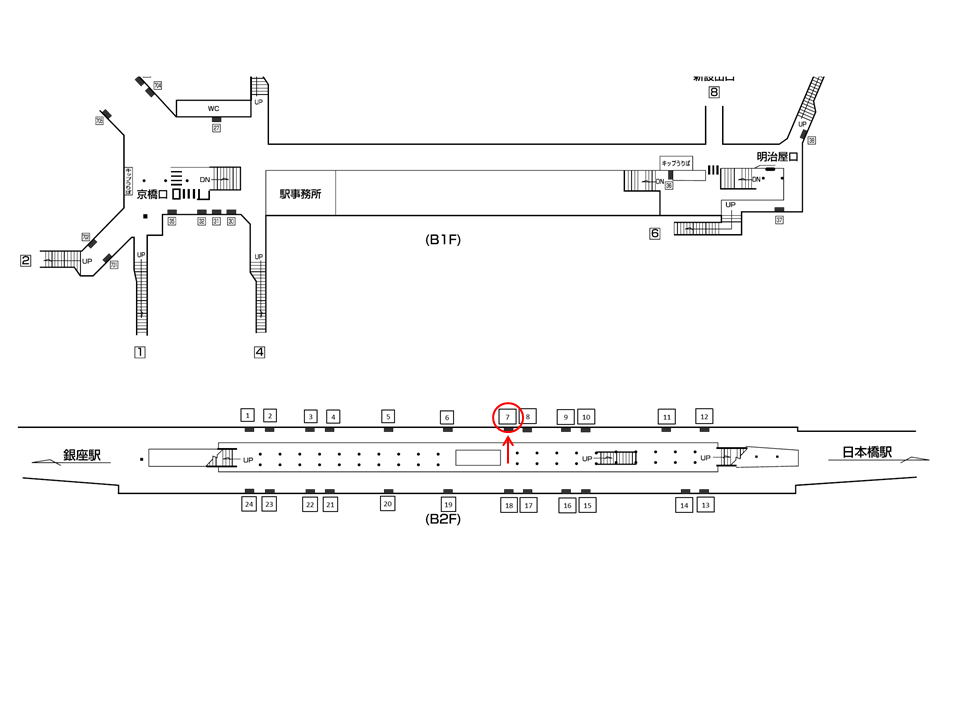 サインボード「銀座線 京橋駅 №7」は銀座線ホーム中ほどにございます。