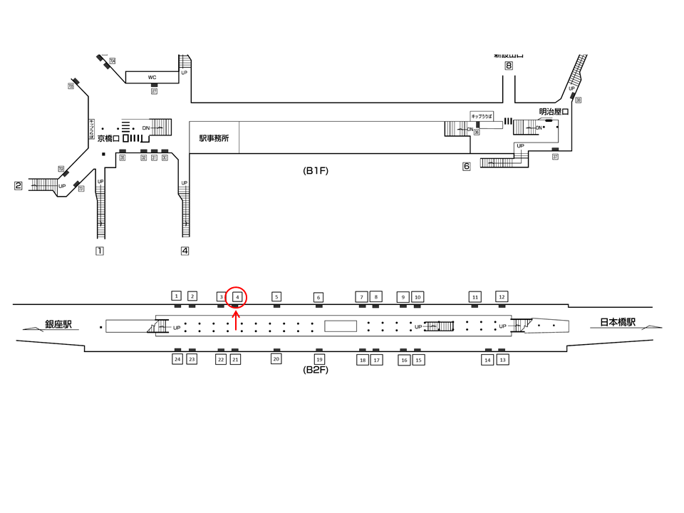 サインボード「銀座線 京橋駅 №4」は進行方向後方の銀座方面改札寄りホームにございます。