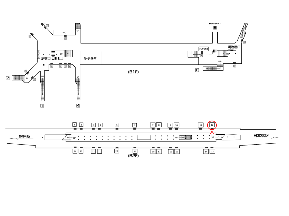 サインボード「銀座線 京橋駅 №12」は進行方向の先頭、明治屋方面改札寄りにございます。