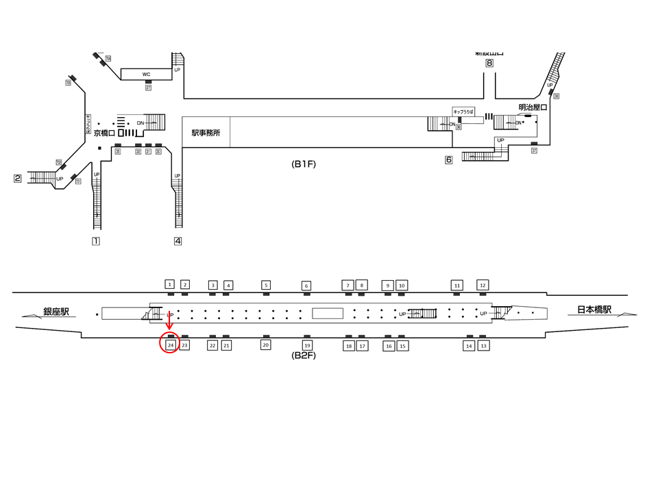 サインボード「銀座線 京橋駅 №24」は銀座方面改札への階段付近、銀座駅寄りにございます。