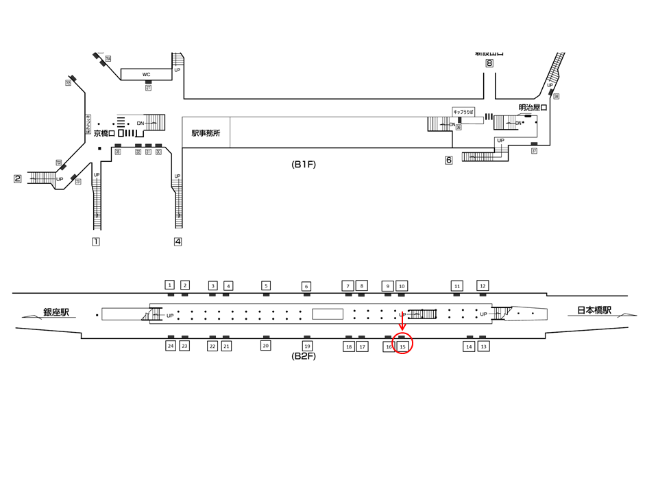 サインボード「銀座線 京橋駅 №15」は銀座線ホーム中ほど、明治屋方面改札寄りにございます。