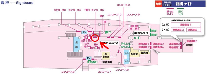 下り電車を利用する方はもちろん、上りホームから降りて改札へ向かう方も視認可能で、多くの利用者の動線上にございます。