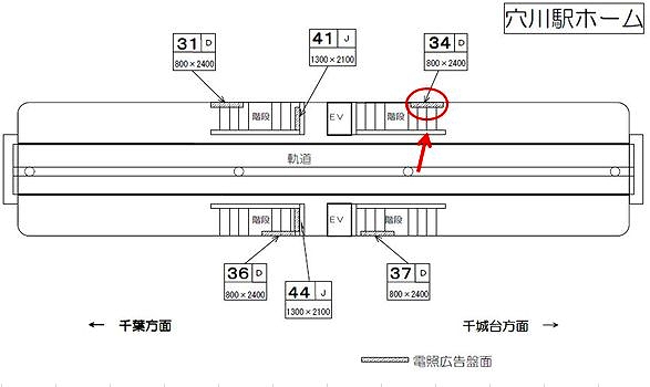 ホーム№34はホーム上の中央やや都賀駅寄りの壁面に位置しており、待ち時間等に広告を見て印象付ける事が可能です。