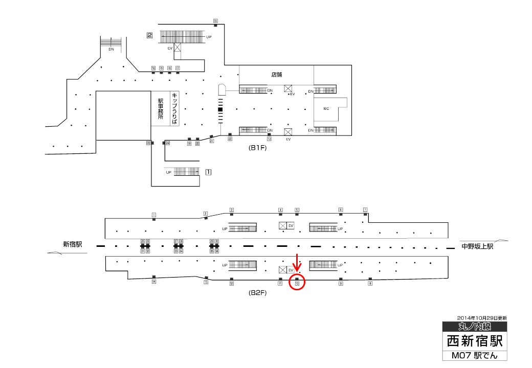 「東京メトロ 丸ノ内線 西新宿駅 №7」は電車進行方向の先頭、中野坂上寄りにございます。地上改札階への階段にも近く乗客が滞留しやすいエリアです。