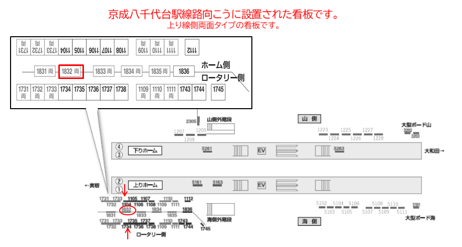 上りホーム実籾寄りに位置した両面看板の№1832は、ホーム上のベンチも近くにございます。