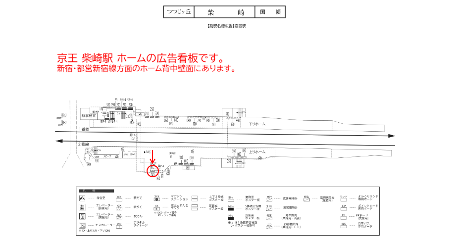このホームにいる方には近い位置で広告を見てもらえます。対岸の新宿方面ホームにいる方には線路を挟む形で正面に見てもらえます。柴崎駅から電車に乗車される方を対象とした広告です。