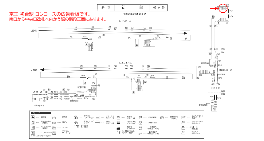 改札内へ向かう移動動線上にあります。初台駅周辺の店舗施設への周知案内にも適した広告看板です。
