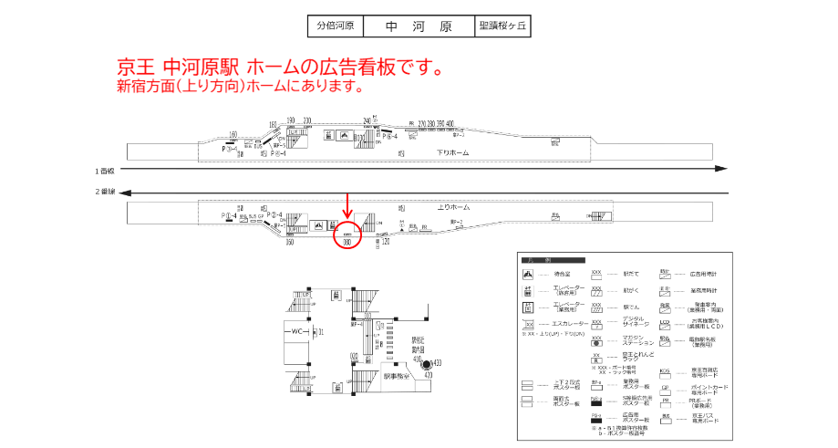 京王本線上りホーム(調布・明大前・笹塚・新宿・都営新宿線方面)の背中壁面に設置された電飾タイプの広告看板です。上り電車を待つ方に後ろ向きにはなってしまいますが、上りホームを行き来する方に近い距離で広告を見てもらえる場所です。 ※下りホーム利用者には線路を挟む形で正対するロケーションです。