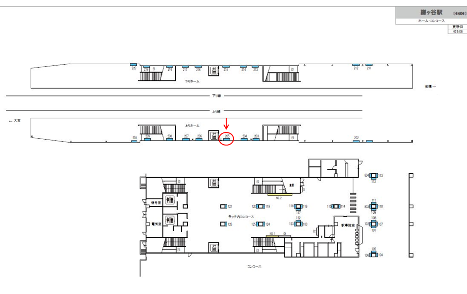 №205はホーム中央付近のベンチそばにあるため、利用者が立ち止まる要素もあり、広告内容をじっくりと見てもらえる事が期待できます。
