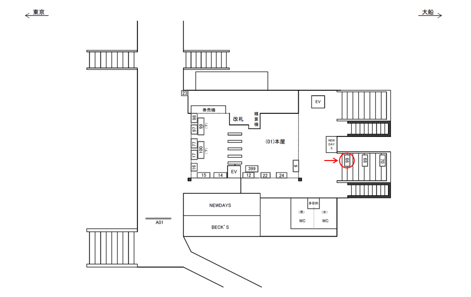橋上改札(ペデストリアンデッキのある改札)から東海道線ホームへ向かう際の階段正面にあります。JR戸塚駅から電車に乗車される方に見てもらえます。