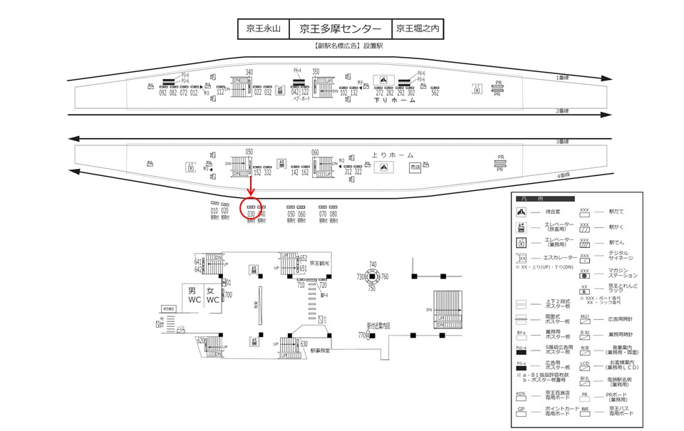 京王 京王多摩センター駅、ホームの駅広告(駅看板)設備のご紹介です。
