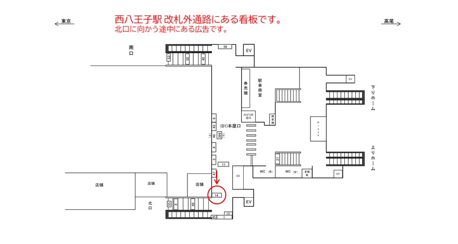 西八王子駅の改札の外通路にある広告看板です。北口方面の出口へ向かう方がこの看板付近を通行します。