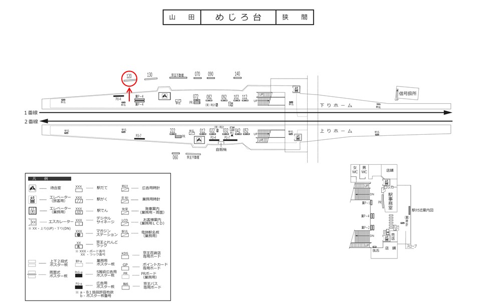 「京王 めじろ台駅 駅だてボード№120」は高尾山口方面に向かう下りホーム側に設置された広告看板です。下り電車を待つ方に近い距離で広告を見てもらえる場所です。