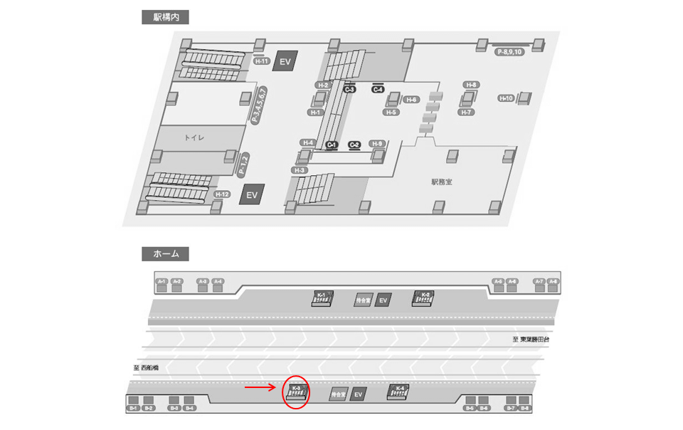 上り線電車利用者が当駅で下車後、ホーム階から改札階へ降りる際の動線上にございます。