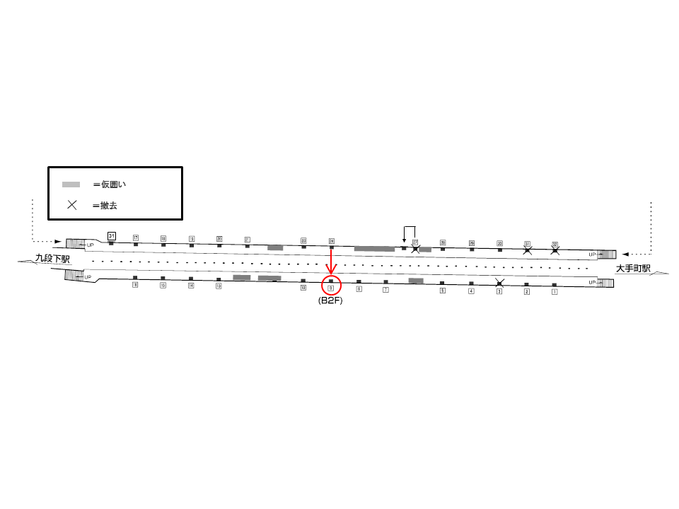 「東京メトロ 東西線 竹橋駅 №9」はホームの中でも中程、九段下駅寄りにございます。竹橋駅を日々利用される方への広告として、ご利用ください。