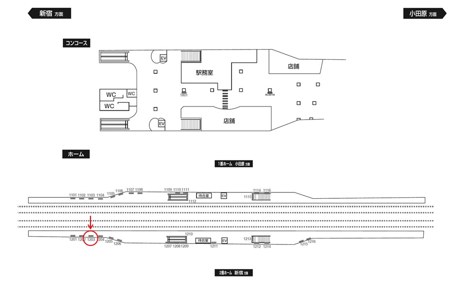 また、線路を挟む形ではありますが、1番ホーム(小田急線、小田原・箱根湯本・唐木田・片瀬江ノ島方面)に正対する位置にあります。