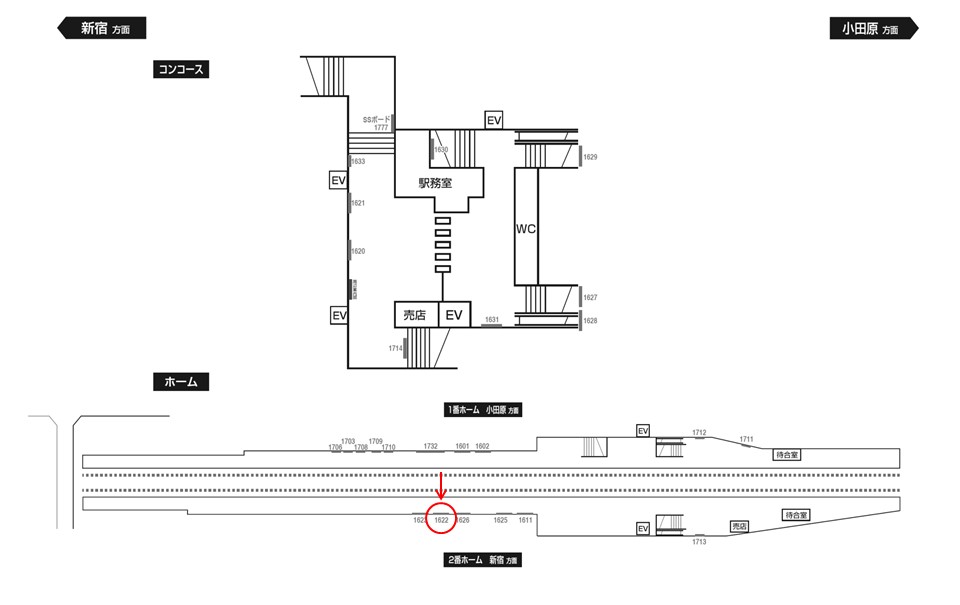 また、線路を挟む形で下りホーム(小田急線、小田原・片瀬江ノ島方面)に正対する位置にあります。