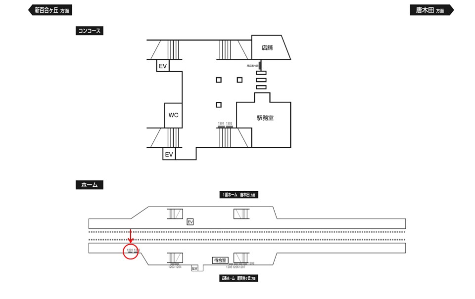 また、線路を挟む形で下りホーム(小田急多摩センター・唐木田方面)に正対する位置にあります。