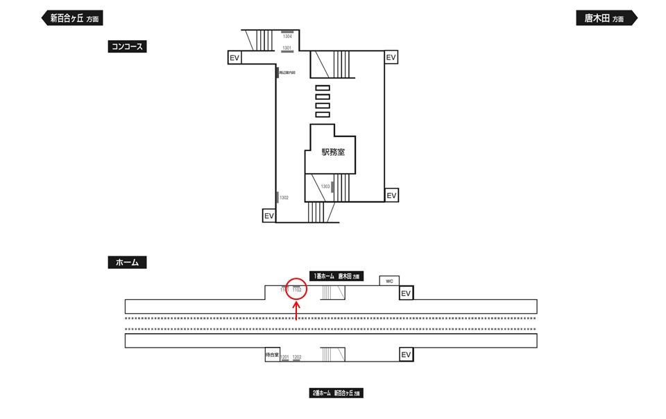 また、線路を挟む形で上りホーム(新百合ヶ丘方面)に正対する位置にあります。