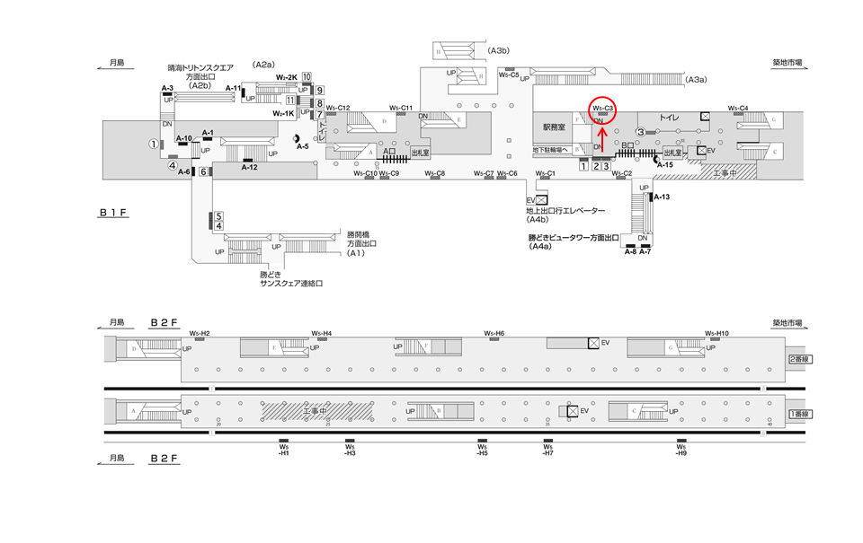主に新島橋方面改札を利用し、大門・六本木・新宿方面ホームへ向かう際、また門前仲町・両国方面から勝どき駅で下車し、新島橋方面改札へ向かう際にご覧いただけるロケーションです。