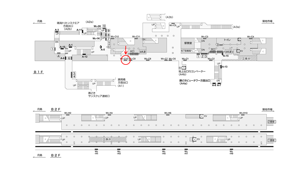 勝どき駅で下車し晴海トリトンスクエア方面改札を利用される方、外通路を行き来される方にご覧いただけるロケーションです。