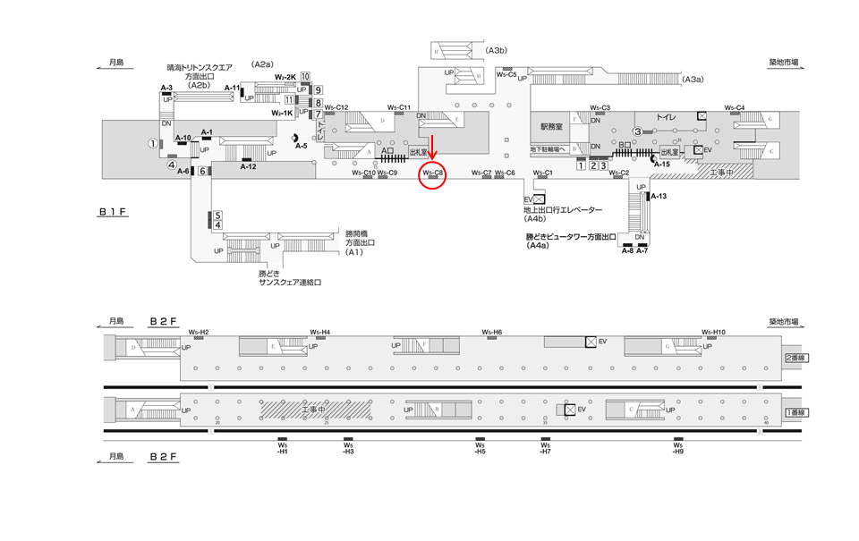 主に勝どき駅で下車し晴海トリトンスクエア方面改札を利用する際、また勝どき駅駅構内を行き来される際にご覧いただけるロケーションです。