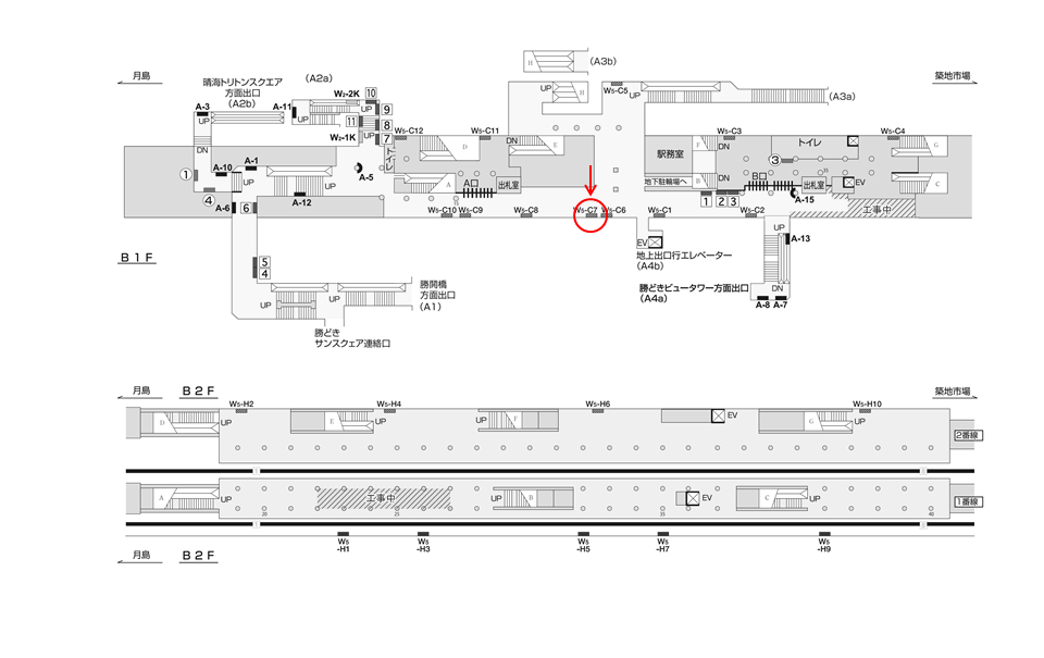 都営大江戸線 勝どき駅、コンコースの駅広告(駅看板)の設備紹介です。
