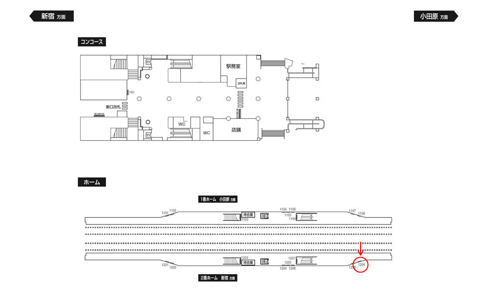 「小田急 和泉多摩川駅 №1209」はホーム(新宿・千代田線方面)の背中壁面に設置された広告看板です。こちらの看板は上りホームの中でも最も登戸駅寄りにございます。