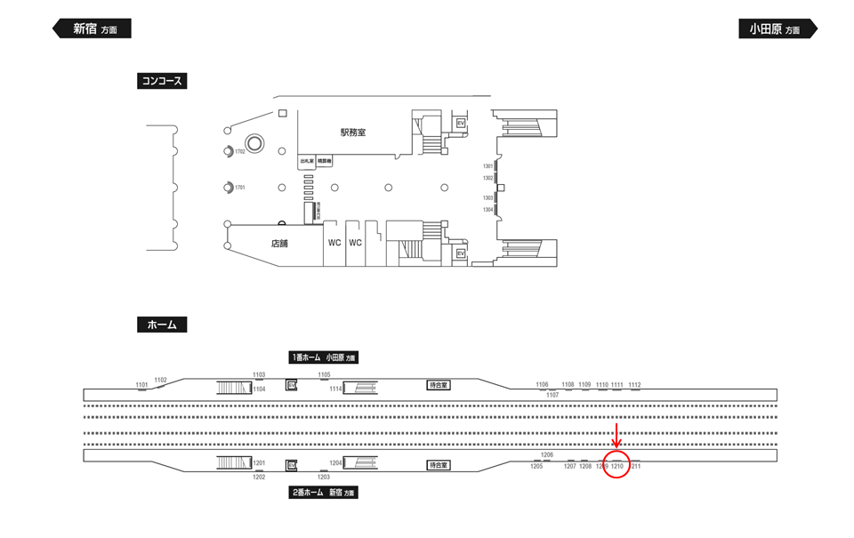 「小田急 喜多見駅 №1210」は上りホーム(新宿・千代田線方面)の背中壁面に設置された広告看板です。