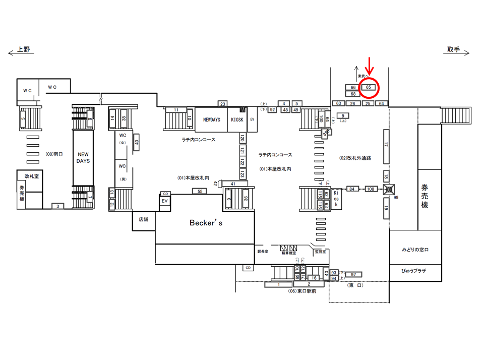 東武野田線や高島屋方面からJR改札や東口方面へ向かう際に正対する位置にございます。