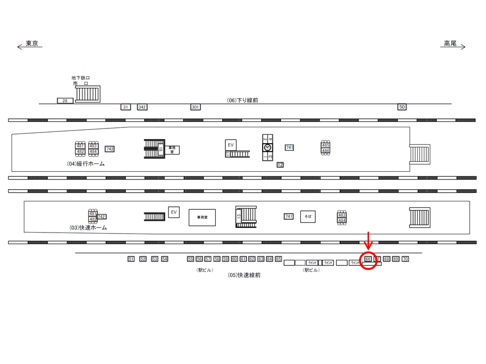 荻窪駅は西改札と東改札の二つの改札がありますが、駅看板「快速線前№54」はプラットホームの中でも東改札寄りに設置されています。(阿佐ヶ谷寄りです)東改札は北口と南口を出入りする方が利用する改札です。