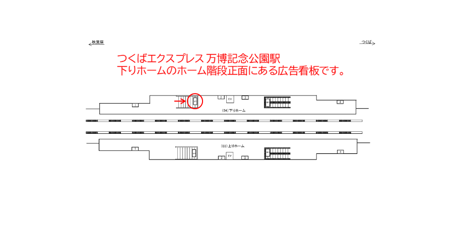 駅看板「つくばエクスプレス 万博記念公園駅 下りホーム№5」はつくばエクスプレス下りホームの階段正面に設置された電飾タイプの広告看板です。この広告看板は秋葉原・北千住・流山おおたかの森・守谷方面から万博記念公園駅で下車し、階段を使って改札へ向かう際にご覧頂ける場所にございます。