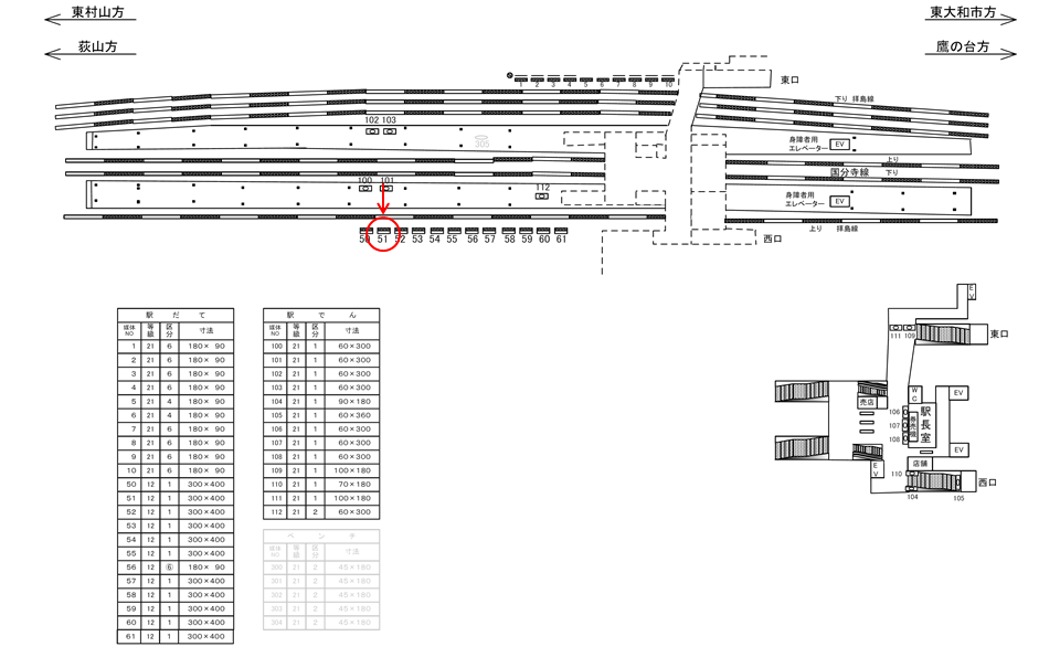 駅看板(西武拝島線線路前・西武国分寺線、西武拝島線ホーム・改札外コンコース)、ポスターボード(改札内コンコース)などの広告設備がございます。