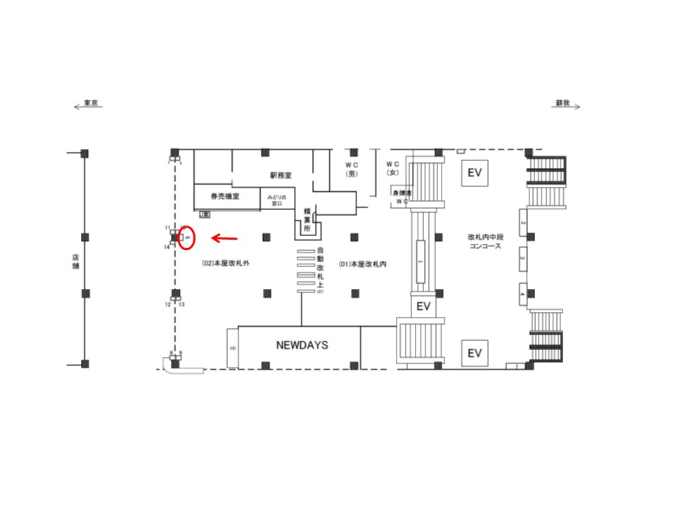 JR京葉線 検見川浜駅の改札外の看板です。改札を出てバスロータリー・ショッピングセンター・区役所側に向かう際に見えますので、誘導案内に最適な看板です。