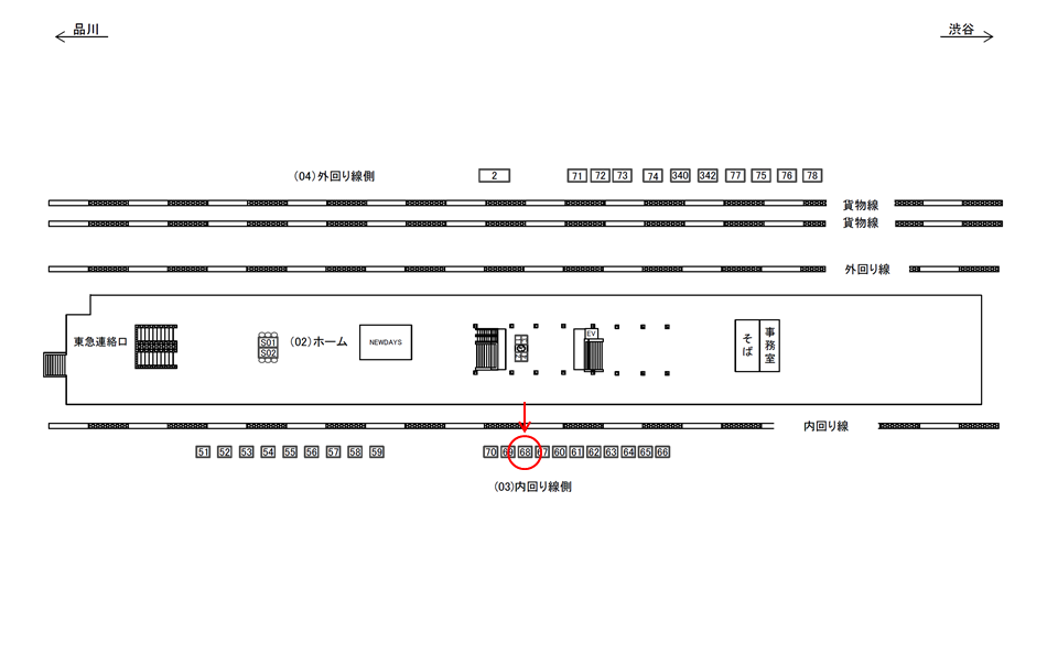 ○内回り線側№69 線路前(JR山手線内回り 品川・東京・上野方面) |