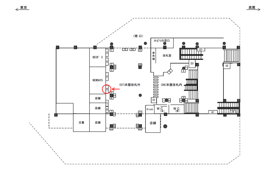 改札外、改札正面のNewDays上部に設置された電飾タイプの広告看板です。改札を出る真正面です。駅を出る方に向けた誘導案内広告に適した位置にございます。南口側、北口側を問わず案内看板としてご利用いただけます。