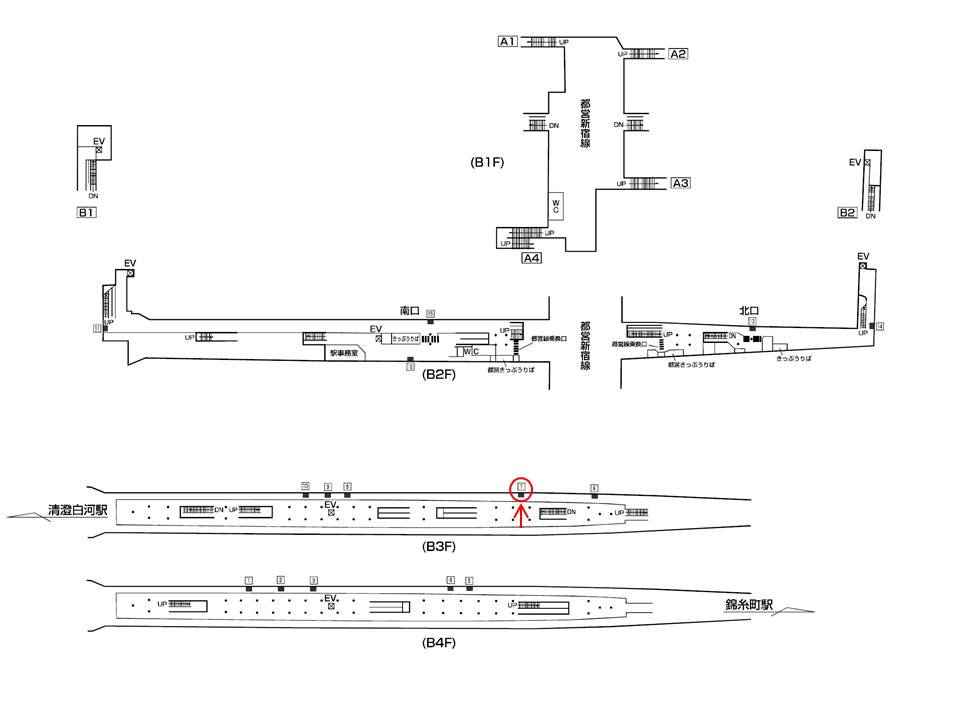 住吉方面改札(出口B2側)へ向かうエスカレーターが付近にございます。