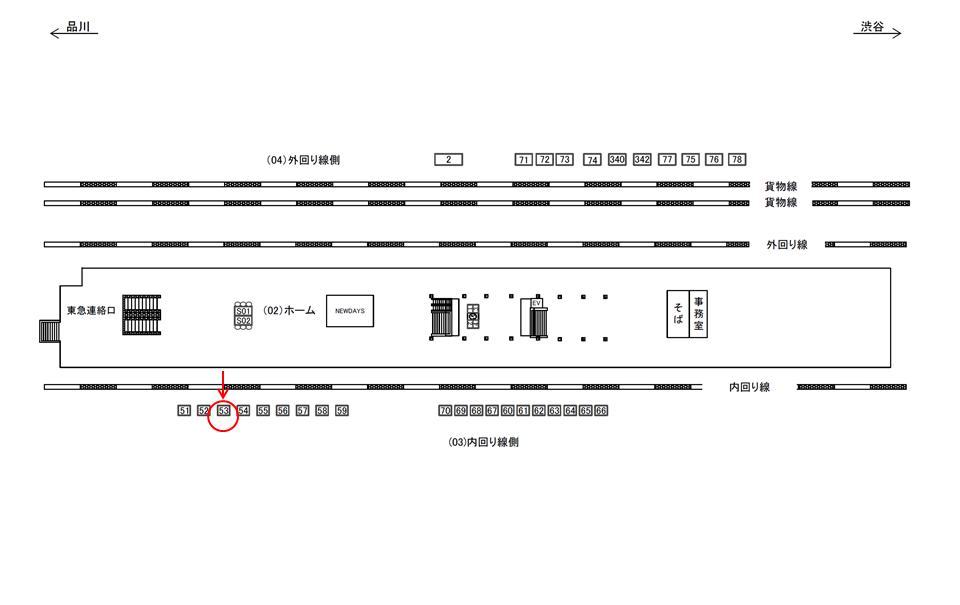 ○内回り線側№52 線路前(JR山手線内回り 品川・東京・上野方面) |