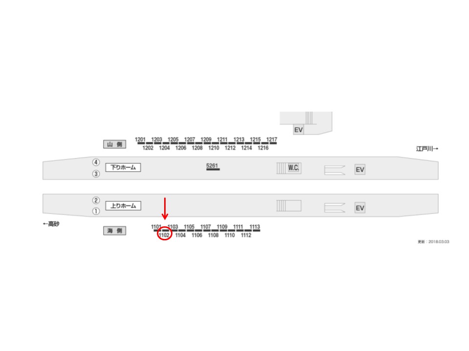 京成本線 小岩駅の上りホーム(高砂・青砥方面)の看板です。上りホームで列車を待つ方に向けて訴求可能です。こちらの№1102はベンチの前にございますので、ベンチに座る方にも見せる事が可能です。