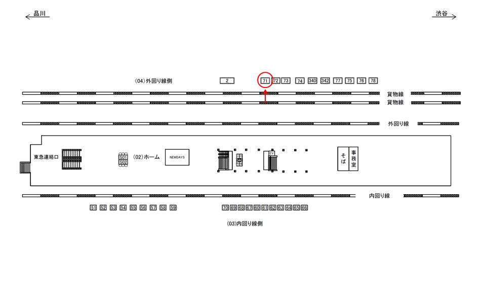 ○内回り線側№70 線路前(JR山手線内回り 品川・東京・上野方面) |